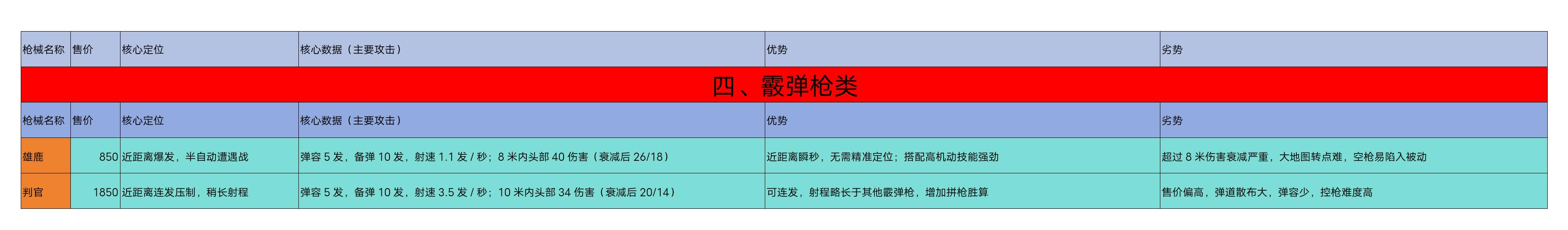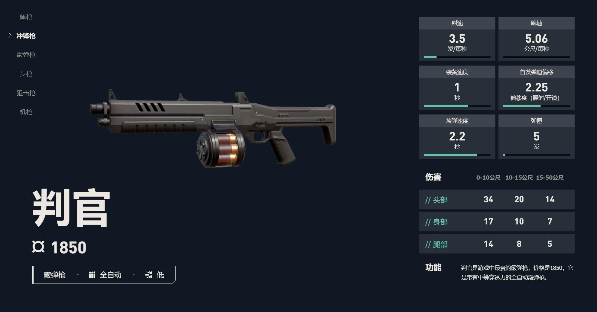 判官(售价1850)判官是一款可连发的霰弹枪,适用于搭配技能的近距离作战。弹容量5发,备弹量10发,射速3.5发/秒,手持移速5.06米/秒,装备速度1秒,换弹速度2.2秒。10米内命中头部伤害34(衰减后20、14),上身17(衰减后10、7),下身14(衰减后8、5)。可以连发,在手游当前版本中,近距离能以中等速度连发,只要保证不空枪就能发挥威力;射程比其他霰弹枪稍长,增加了拼枪获胜的概率。售价偏高,限制较多,实战中难以发挥优势,对个人运用技巧要求较高;弹道散布大,射程有限,三枪可能都打不死一个人,弹容量也较少。