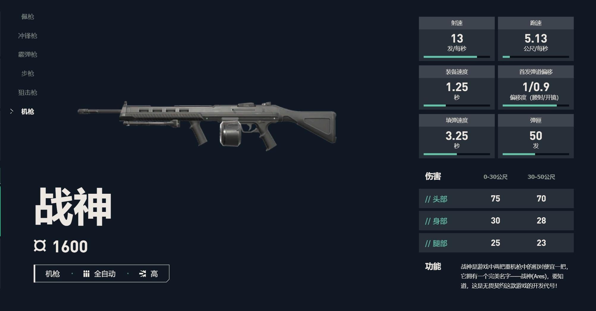 战神(售价1600)上手简单,高穿透,适合枪法稍差的玩家。弹容量50发,备弹100发,射速13发/秒,30米内头部伤害72(衰减后67),上身30(衰减后28),下身25(衰减后23)。1600的售价搭配小甲总花费低,高穿透使其可穿射部分点位。但手感一般,控枪略有不适。实战中需熟悉可穿点位,辅助队友造成伤害。