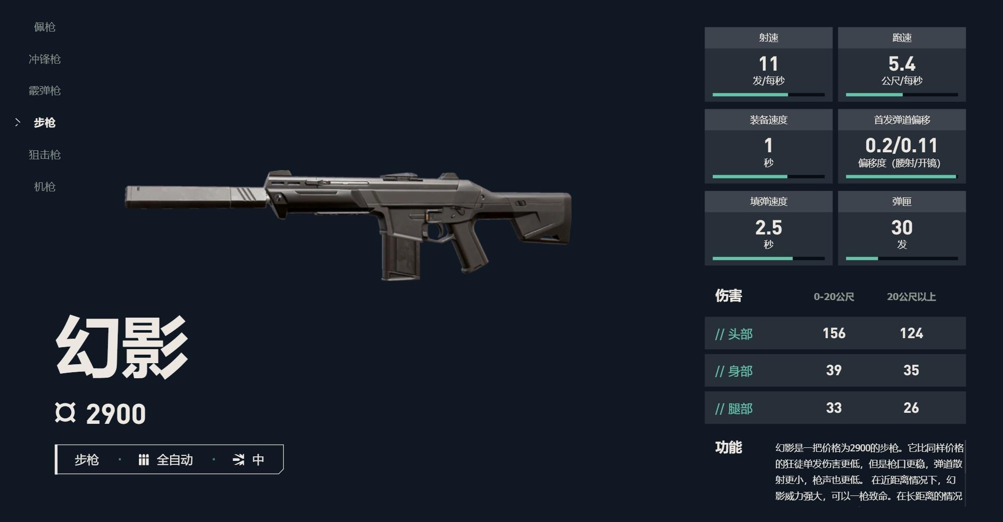 幻影(售价2900)射速快、压枪稳,全自动模式,近距离可瞬秒,远距离也有战力。弹容量30发,备弹60发,射速11发/秒,15米内头部伤害156(衰减后140、124),上身39(衰减后35、31),下身33(衰减后29、26)。射速快使其近距离无需爆头即可瞬秒,稳定性高适合蹲扫。但15米外伤害衰减,依赖控枪。实战中需根据队伍经济选择,控枪优先打上身。