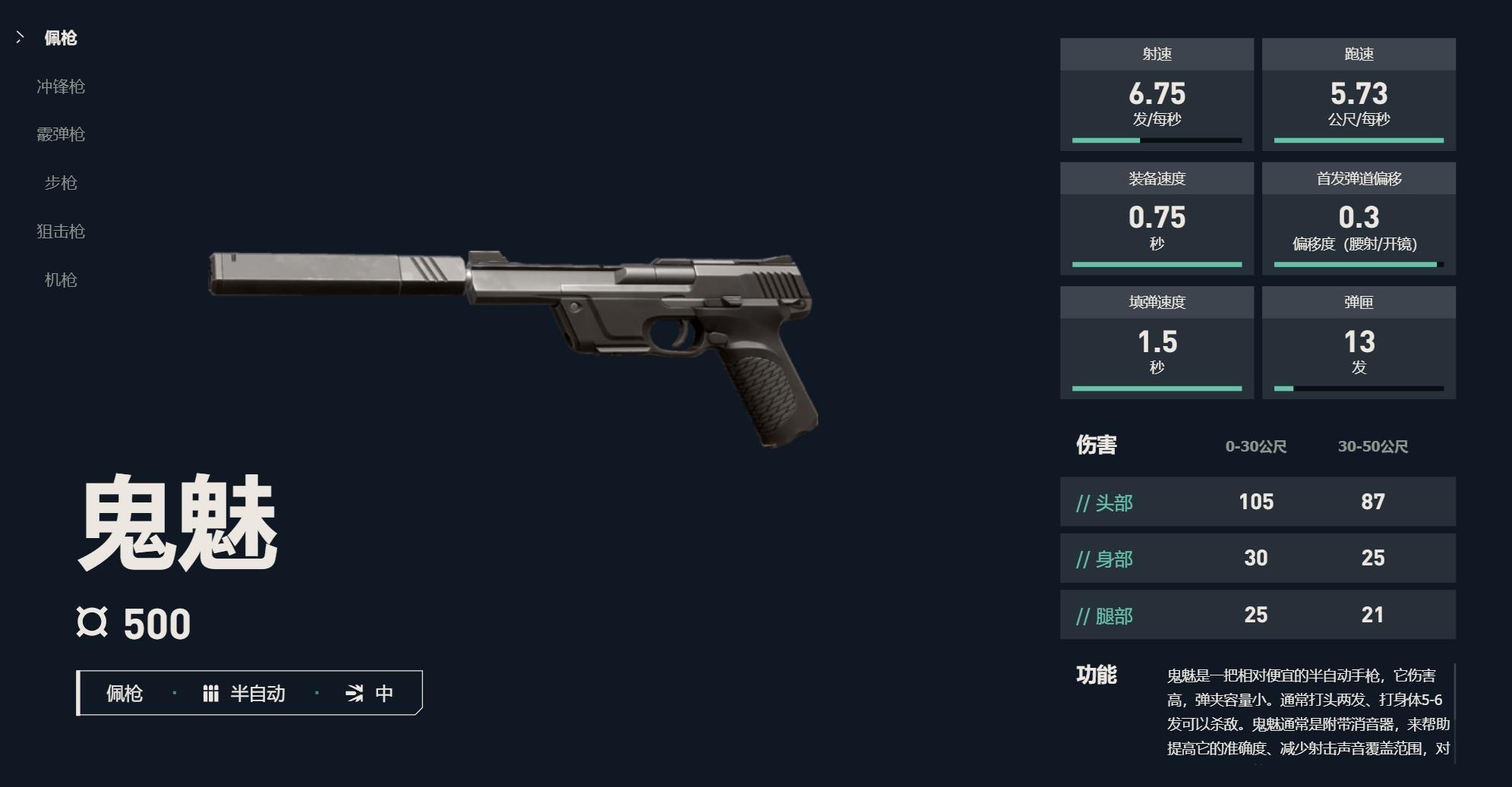 鬼魅(售价500)出场率颇高,自带消音器,精准度高。弹容量15发,备弹45发,射速6.75发/秒,0-30米头部伤害105(衰减后87),上身30(衰减后25),下身25(衰减后21)。中远距离作战是其强项,30米内无甲敌人可被一枪爆头。但它对枪法要求高,打身体伤害性价比低,它耶是手枪里面准星回正最快的技能使用容错率也低。使用时,20米外建议采用“两枪一停”的节奏保证命中率,搭配芮娜、火男等角色能更好地发挥作用。