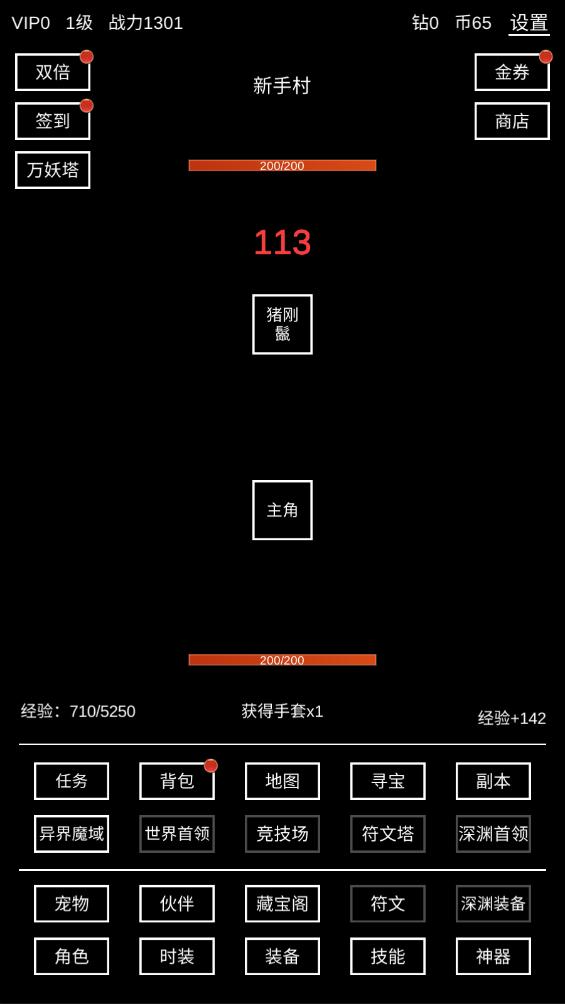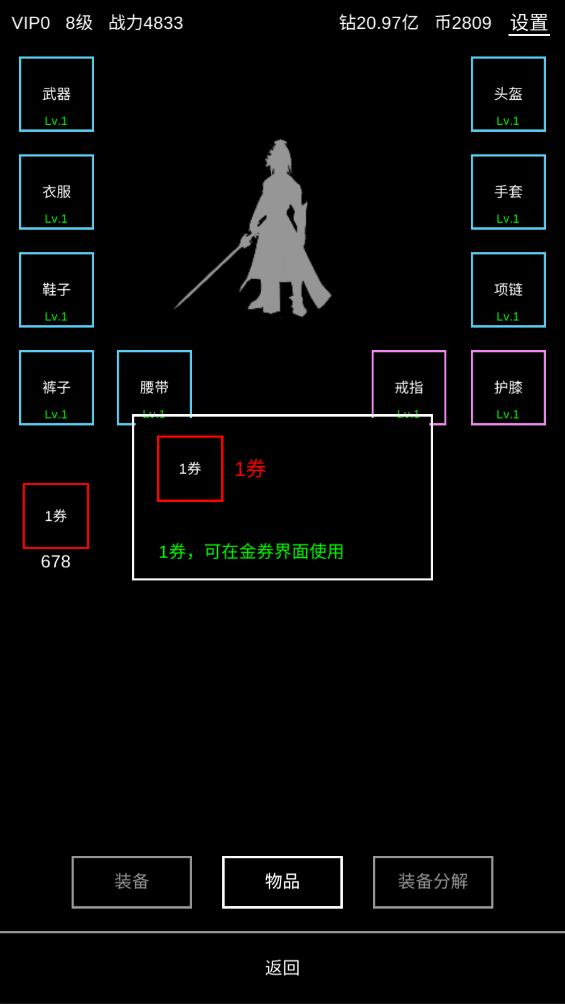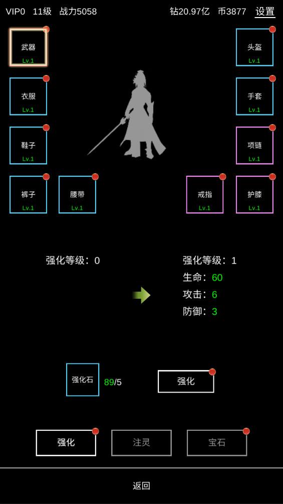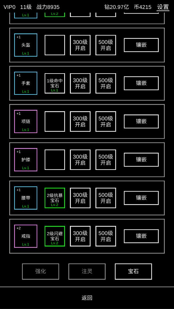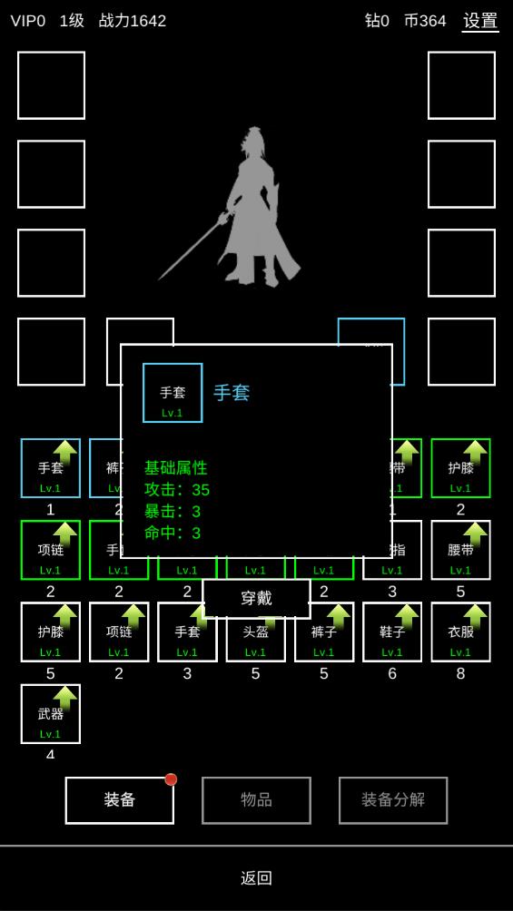 3.在装备里穿戴各种装备,提升自己的战力。