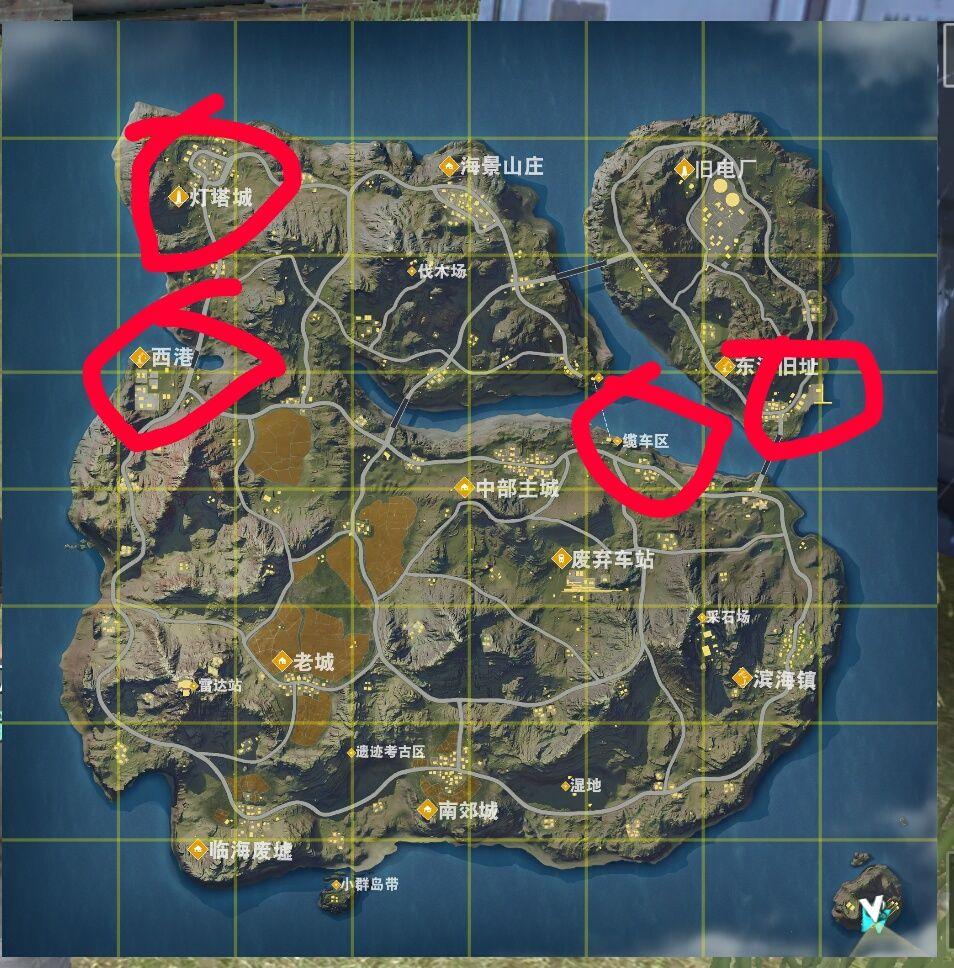 6.尽量不要选择中心城或者老城,旧电厂,灯塔城这种兵家必争之地,初期还是安稳发育的好。(红圈为个人喜好跳点