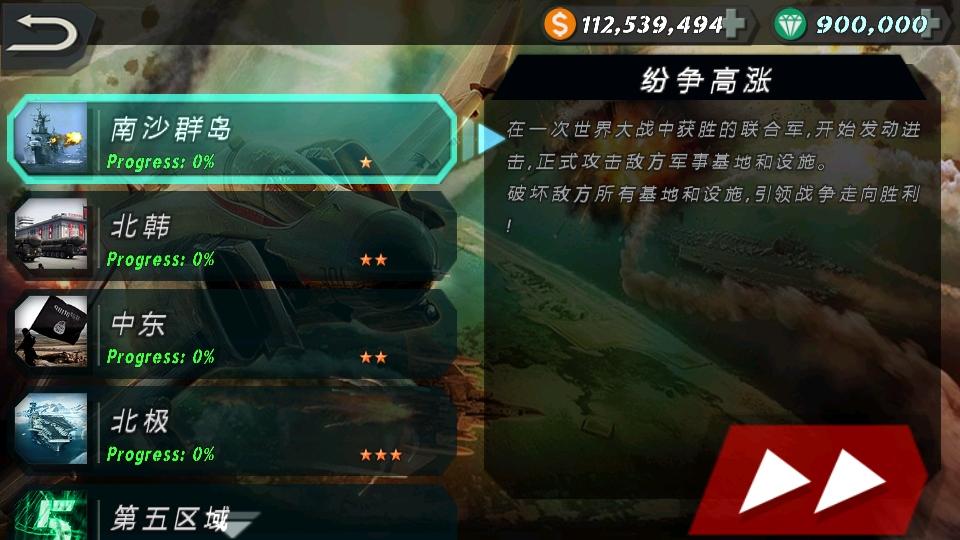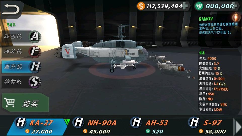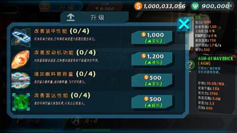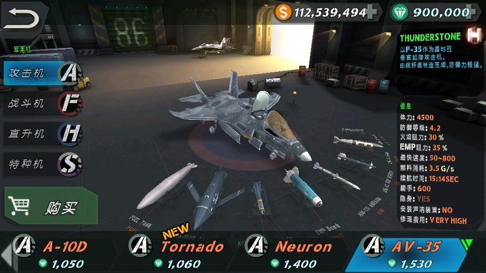 具备攻击机、战斗机、直升机和特种机四大类型的战机,购买需要达成一定的军衔等级,然后付出一定的金币或钻石即可获得。