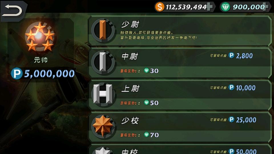 从最低的少尉开始,通过完成任务,获得晋级点数来晋升更高级别的军衔。