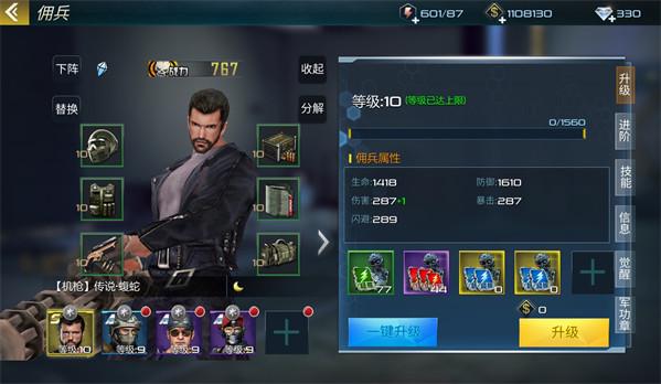 佣兵拥有不同的等级:SSS、SS、S、A、B级,SSS级自然是最强佣兵。佣兵界面右侧是基础属性,佣兵可提升自身升级、技能等级。低品质佣兵还可以进阶提升战斗力。