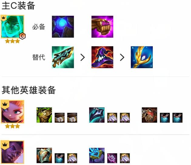 3、装备推荐:主c武器必备羊刀和饮血剑,第三件优先泰坦,没有的话水银或者大天使都可以;瑟庄妮给鬼书和圣盾使的誓约;蕾欧娜给狂徒,反甲和离子火花;瑟提给三圣杯。