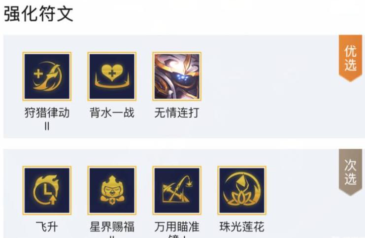 2、强化符文选择:优选狩猎律动2,背水一战,无情连打;次选飞升,星界赐福2,万用瞄准镜,珠光莲花。