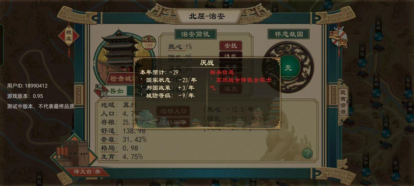 邦邑署中可以看到本国所有城池的状态,包括人口数量,舒适度,厌战度以及叛乱风险等。