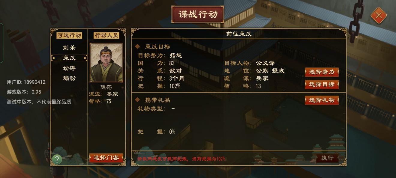 小贴士:谍战外交的成功率跟所派出的门客流派智略有关,刺杀和策反的成功率不仅是跟自己派出的门客有关,还跟被刺杀或被策反对象的流派和智略有关。墨家最擅长搞谍战同时也最难被刺杀策反。