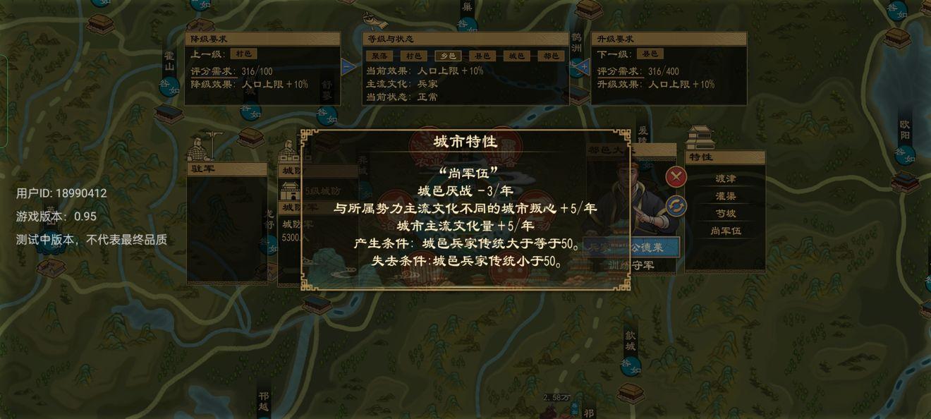 城邑的地形,发展度,主流文化,都会带来不同的城市特性,君上可以根据城邑特性来针对性的安排发展方针。