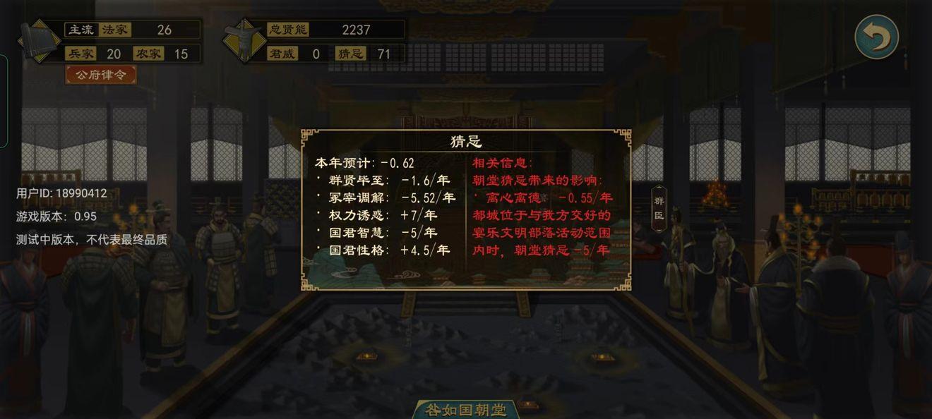 不设立储君,朝堂流派过于杂乱【三种以上】会增加猜忌度,处罚功勋值高的朝臣,频繁更换朝臣都会增加猜忌,降低猜忌能增加国家稳定度和君威。