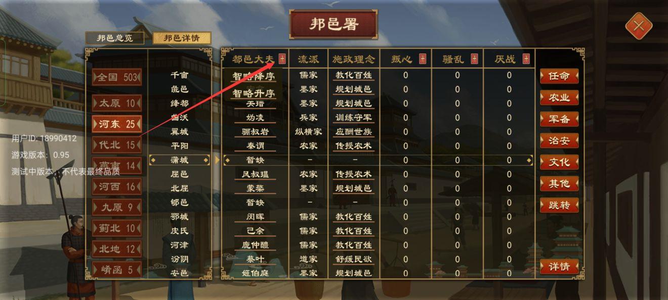 邦邑署:查看全国各地都邑大夫和城邑信息的地方,可以进行一键任用大夫,根据判心,骚乱,厌战的柱状图了解全国各地的详情进行一键操作,也可以在详情里面单独对一座城邑进行任命