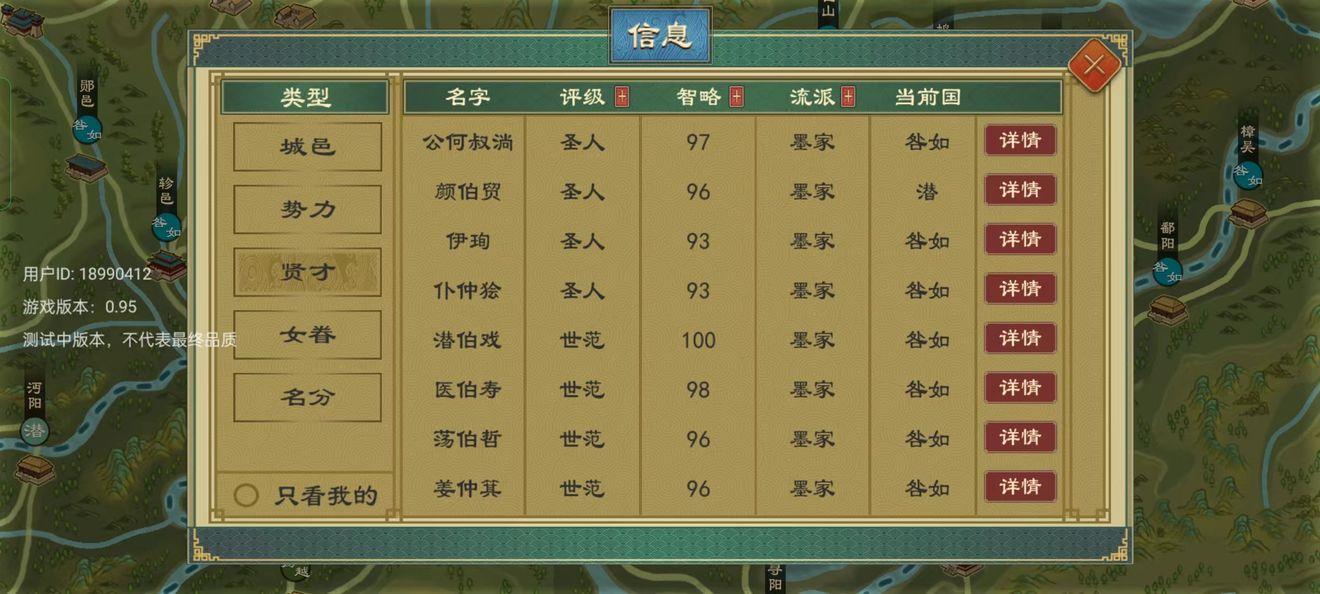 详情列表带有加号的,都可以进行高低排序查找,方便我们根据情况来任免大夫。判心高的我们可以用纵横家降低骚乱,骚乱用儒家,厌战用阴阳家等等,下面是小夏亲自测试出来的所有流派作用。