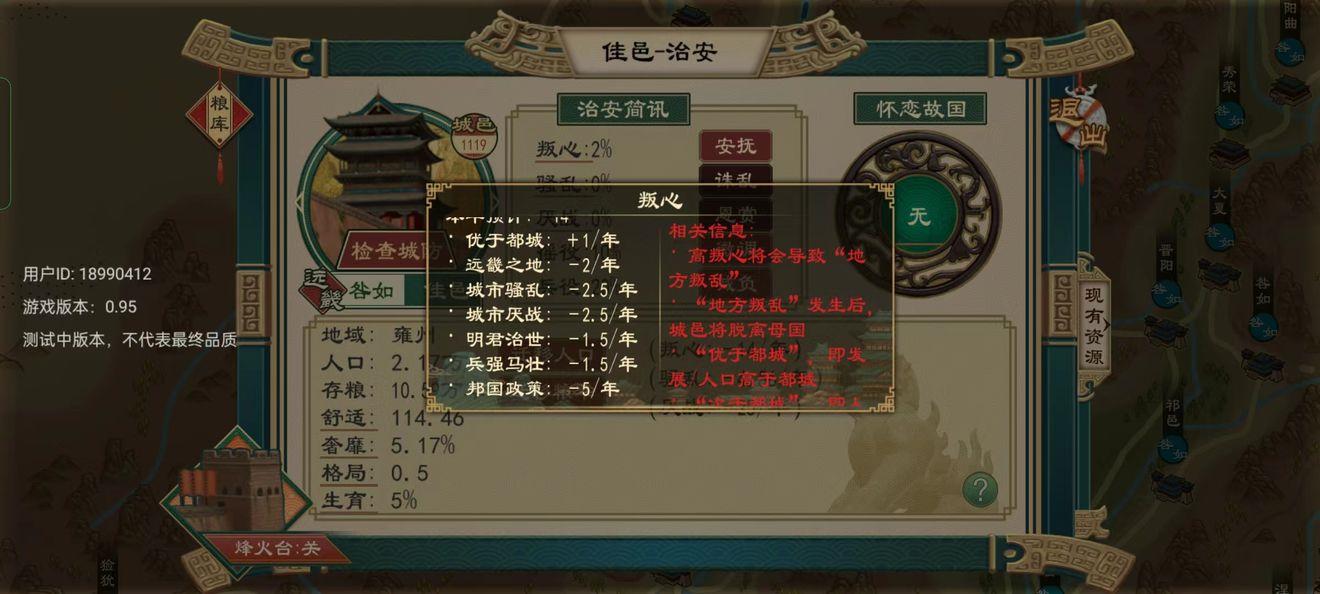 当城邑文化和主流文化不一时判心就会上涨,判心过高会发生叛乱,可以通过【安抚】降低判心,迁都到判心高的城邑地区,但是想要彻底解决问题还是得加快文化传播让城邑文化和国家主流文化统一,如果实在是压制不住,可以分封给宗室。