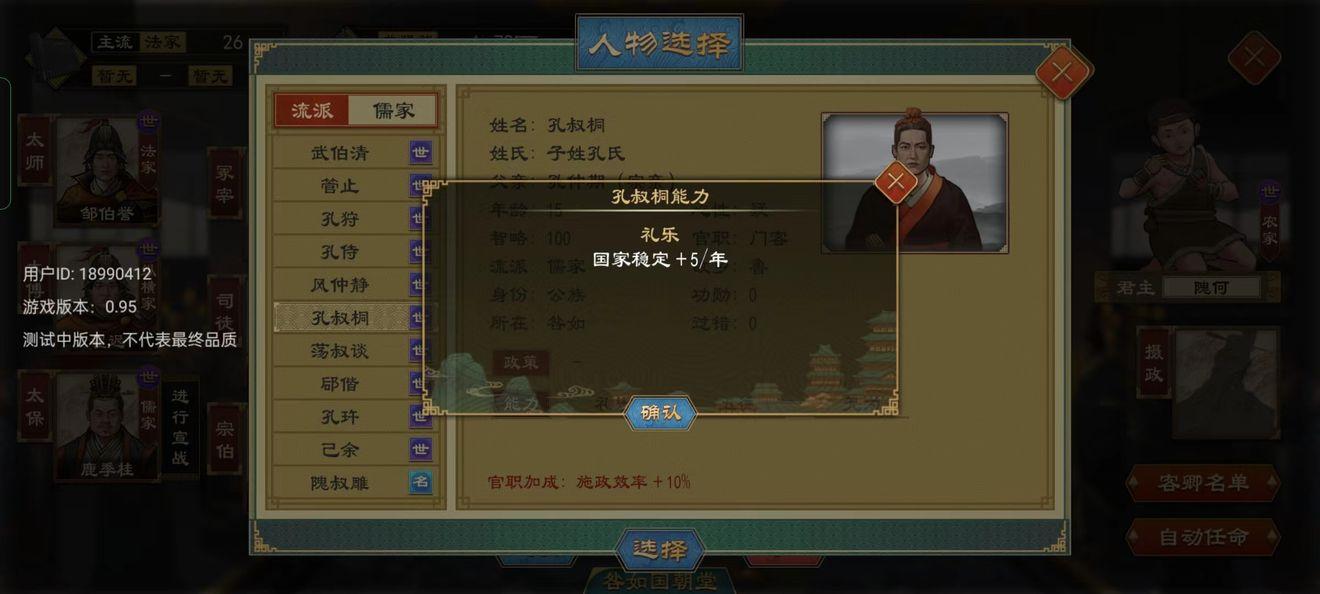 政策:实行政策和选择国家流派,君上可以根据自己的玩法来选择合适的流派,夏酱推荐新手可以尝试一下,儒家,农家,道家,上手后可以玩法家,兵家,想搞谍战等特殊玩法可以玩,墨家,道家。