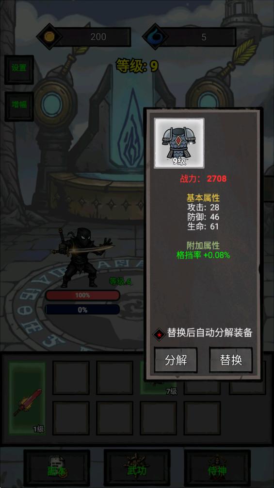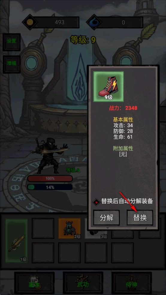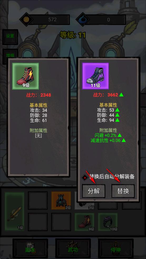6.当获得同一个部位的装备时,如果属性更好就点击【替换】,如果属性差就点击【分解】。