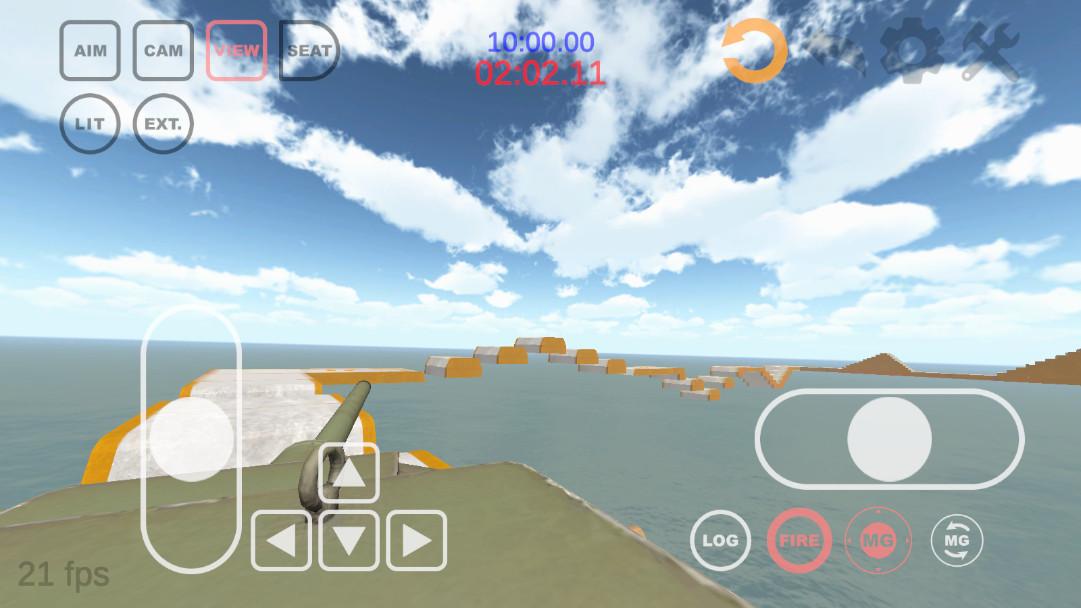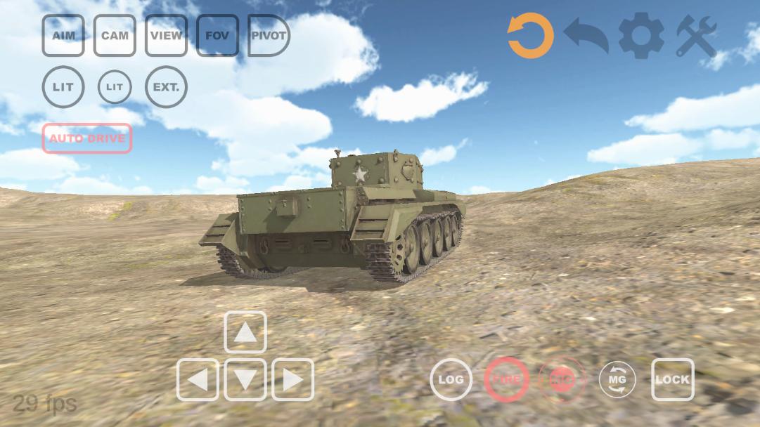 3.左边按钮控制前进,右边按钮控制左右方向,右下角第一个按钮控制开炮,第二个按钮则让炮塔跟随摄像机旋转。