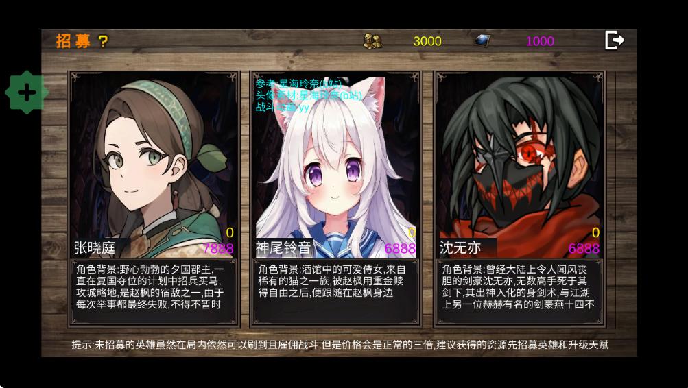 初入游戏,有金币和点券的话,可以优先在英雄招募中,买下韩擒虎(大盾)战役肉盾。颜清菡(再动主角)。赵云(骑兵)能打能抗,主帅第一人选。夏娜(召唤大师),米娅(强力火器),自带强力英雄首选柳如烟(强力法师),周木槿(法师),这两个一起出场有强力大招。苏小小(法师),自带天香技能。徐芸(刀客),战役内和主角每回合能对话,第一次对话就能拿史诗武器。和主角对话还能加物攻、物防和暴击。其他好的人物待大佬补充。