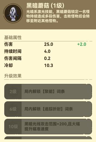 光暗系激光技能,黑暗蘑菇锁定一名怪物持续造成多段伤害,击败怪物后会转移至附近其他怪物。