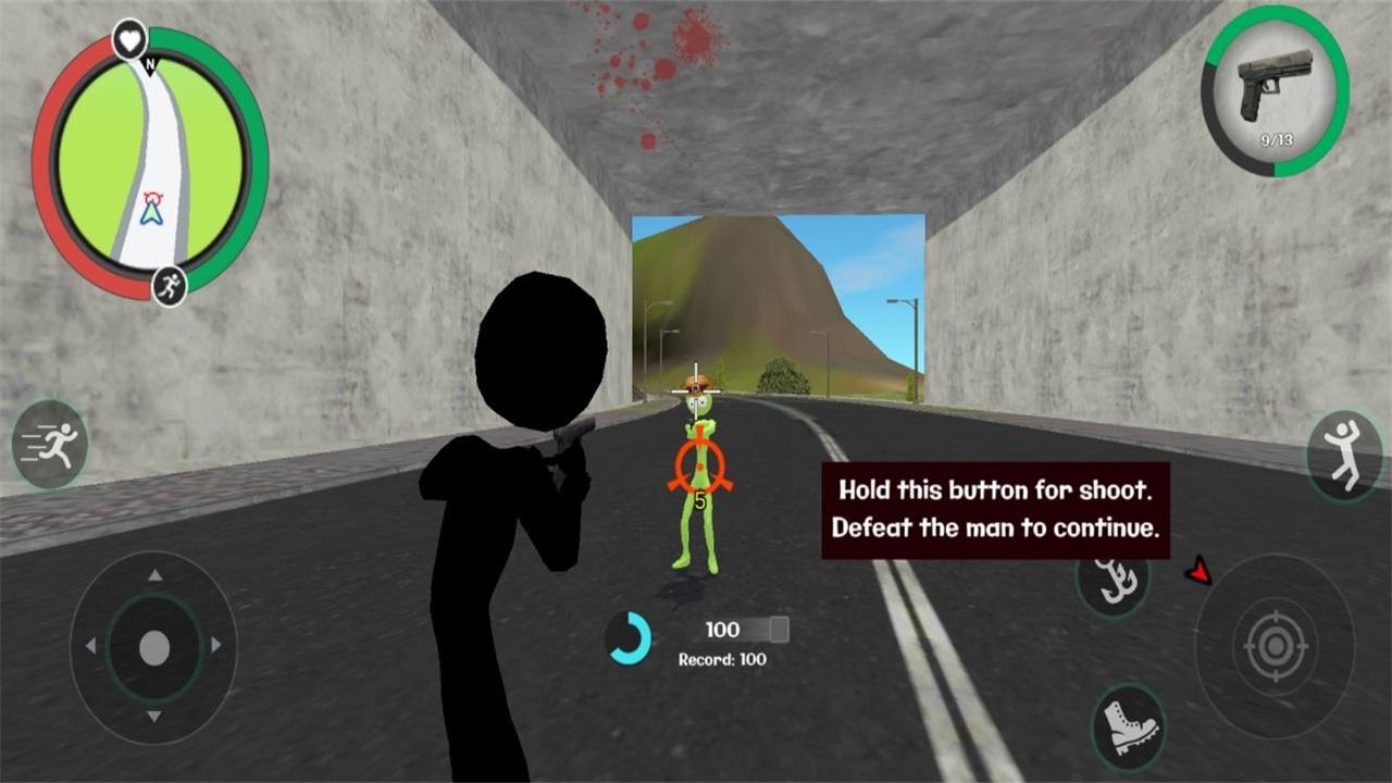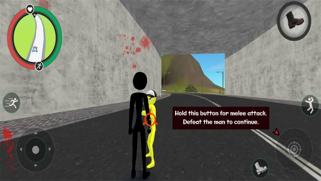 5、点击左侧的摇杆可以控制火柴人进行移动,点击右侧的钩子可以化身蜘蛛侠自由穿梭,点击“人”的图标可以跳跃,点击瞄准镜图标可以进行攻击。