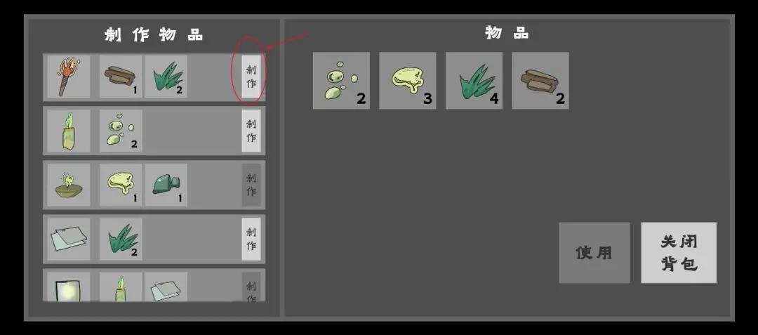 点击打开背包,右边是您在探索中所有获得的物资,而左边是您可以利用物资,制作的物品与光源。当您现有的物资足够制作左边的某一物品时,“制作”二字便会亮起。