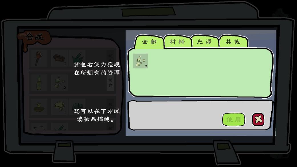 当您完成了伟大的制作,制作完毕的物品会回到右边的背包内。若您制作的物品为可发光的光源,您可以轻点该物品,然后点击右下角的“使用”,使用该光源开始照明。