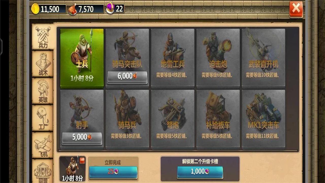 5.单人模式。单人模式中有着5张地图,玩家可以攻克这些地图中的据点来获得金币和食物奖励。每攻克完一张地图的所有据点可以领取一定数量的皇冠。