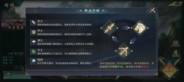 2.对位分为左前,右前,左翼,右翼和大营,只有左前和右前被攻打下后,才会攻击左翼和右翼的武将。所以这可以看出,左前和右前属于承受伤害类,那么就得上输出型的武将,左翼和右翼上辅助型的武将,大营则其上有统帅技能提供buff的武将。