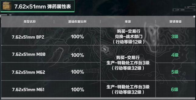 其中7.62x51mm BPZ是3级弹药,可在交易行购买,行动等级达到10级时也可以在战术部门用平时搜索易得的私密笔记簿和酒店宣传海报进行兑换。