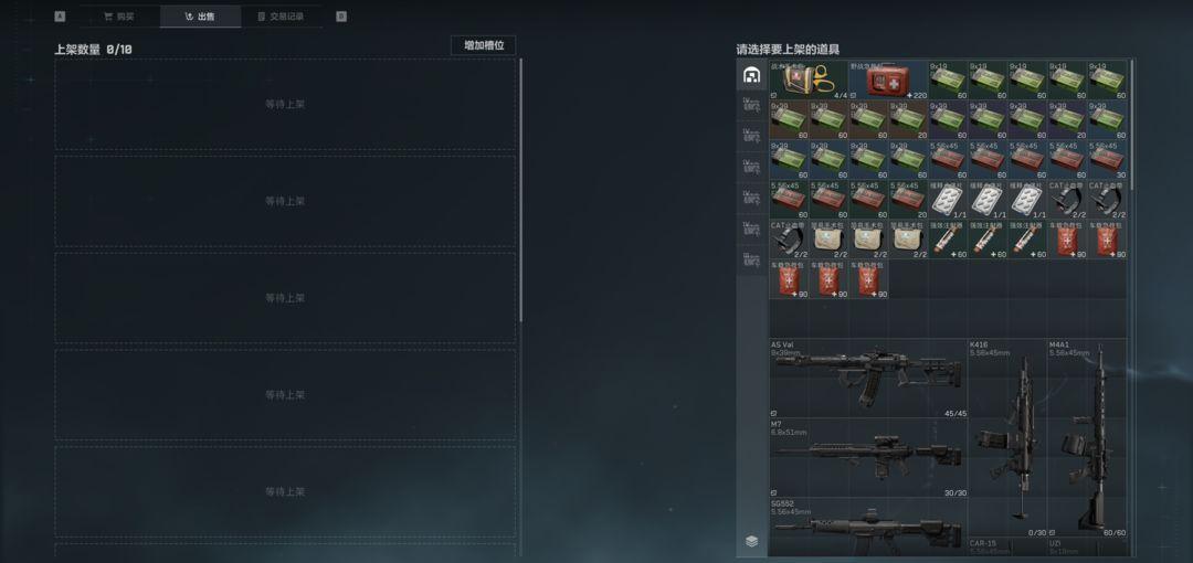 除了进入【交易行】购买以外,我们在行前准备阶段,也可以直接点击空缺的物资栏目,更快捷地购置战斗物资。