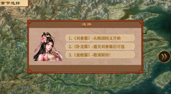 入口方式:游戏开局完成新手关“初出茅庐”后,从《刘备篇》-桃园结义开始开启游戏之旅。
