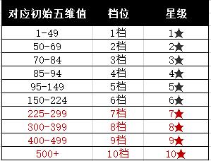 提档&降档&跳档:黄色星星代表武将基础档位;灰色代表掉档,可以吃较少的果子升;绿色是已经升的档。在五维属性处点击➕号消耗道具,可以增长属性,具体提档和降档数值请参考图三。