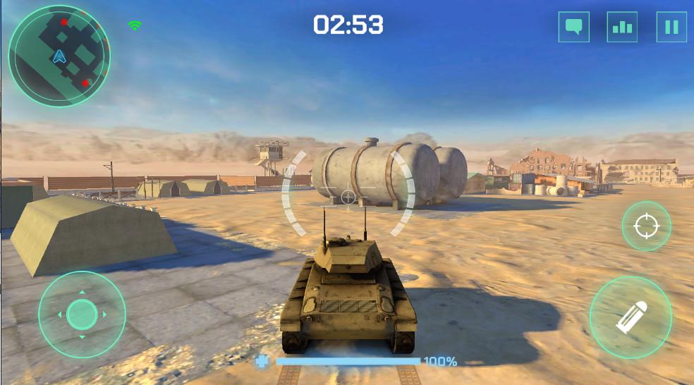 4、使用左方轮盘控制坦克移动,右侧瞄准开镜和射击,左右滑动其他区域控制坦克瞄准目标。