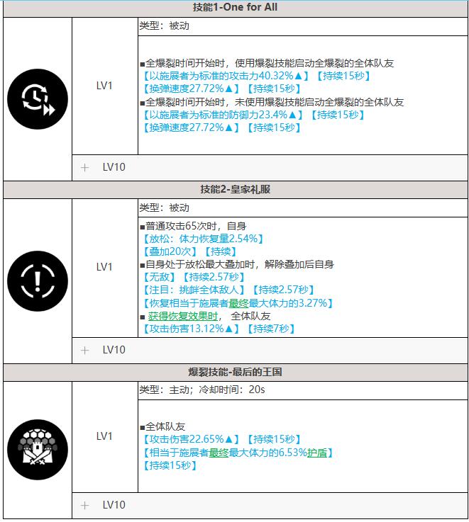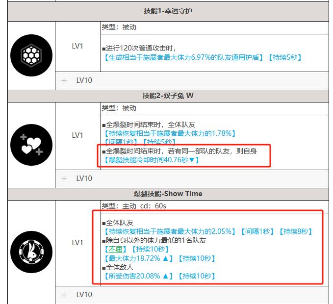 娜嘉(黑JK):负责提供全队核心伤害加成并提供攻击力(需注意:自身要有护盾才能触发大BUFF效果),并提供一定的奶量