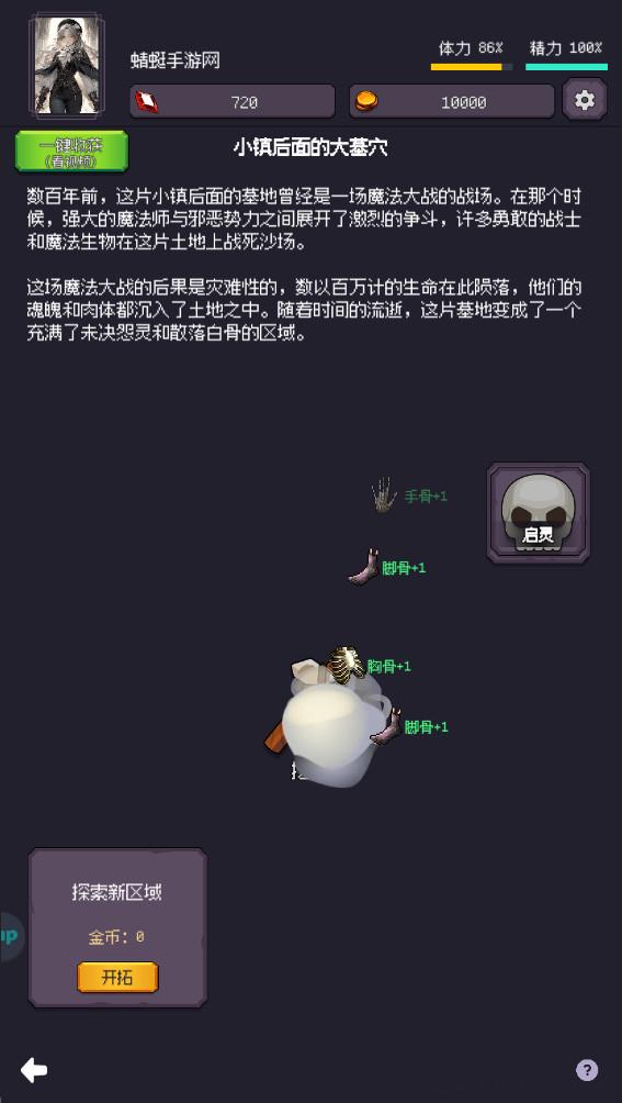 3.选择小镇后面的大墓穴玩家可以玩家后山的坟地,寻找各种腿骨手骨头骨等等,这些骨头可以帮助玩家启灵,提升角色实力。