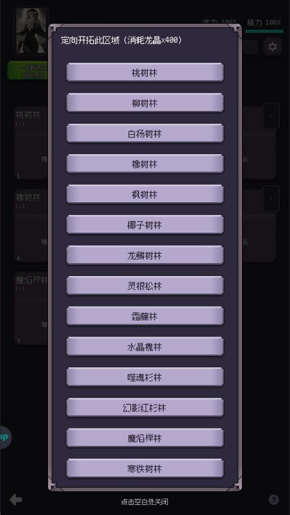 4.野山林内玩家可以看到各种桃树林,柳树林,白杨树林等等,寻找奴仆帮助自己进行砍伐,还可以使用金币购买新的区域。