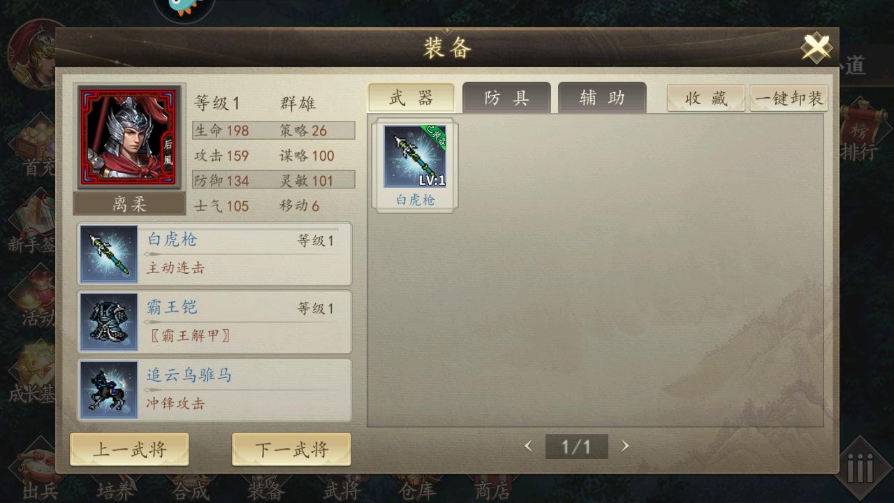皇非绑定了自己的套装,武器奋战4到奋战7(一阶二阶三阶和圣武)辅助带二动马清兵速度很玄学,三五回合就可以清的差不多,但初始攻防s,培养到z需要的果子更多,又因为普通难度敌军没有神将,掩盖了他打boss困难的缺点,综合指数四星半。