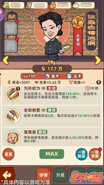 2、女警司常态下会有较高范围输出能力,大侠前期如果缺少范围输出伤害,可以选择女警司培养~