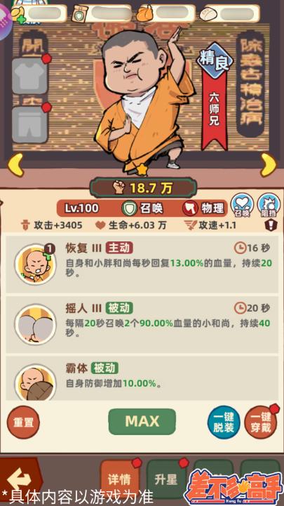 六师兄的被动技能可以增加自己的防御,开启六师兄的主动技能,可以每秒钟给小和尚回复气血。