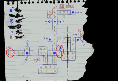 来到三道门房间的右侧,墙上有个纸条显示灯笼会指引你前进,旁边还有台上锁的电脑,交互后会让你输入密码,这时不知道密码,继续前进。