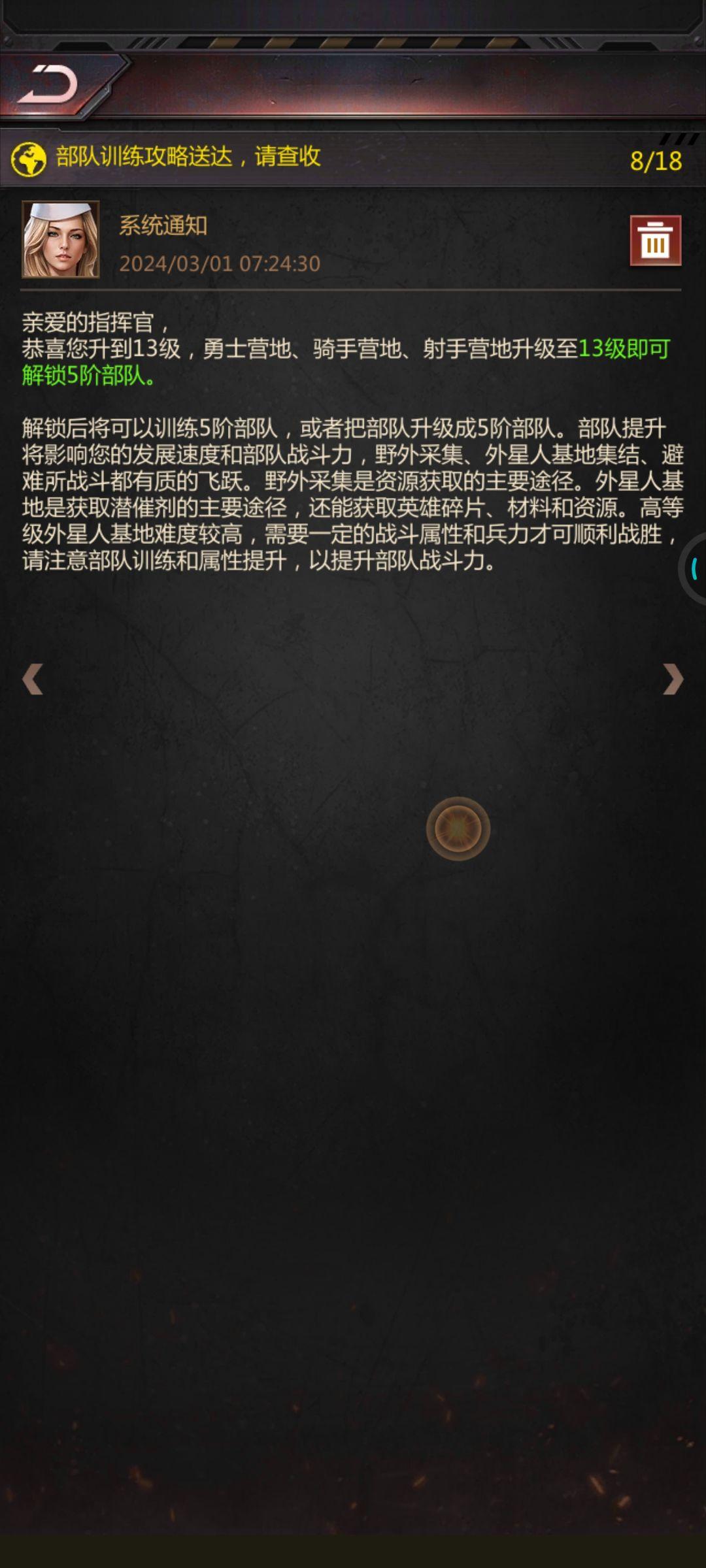 训练营地到13级时才能训练5阶兵。多训练兵才能在世界地图乱杀外星人
