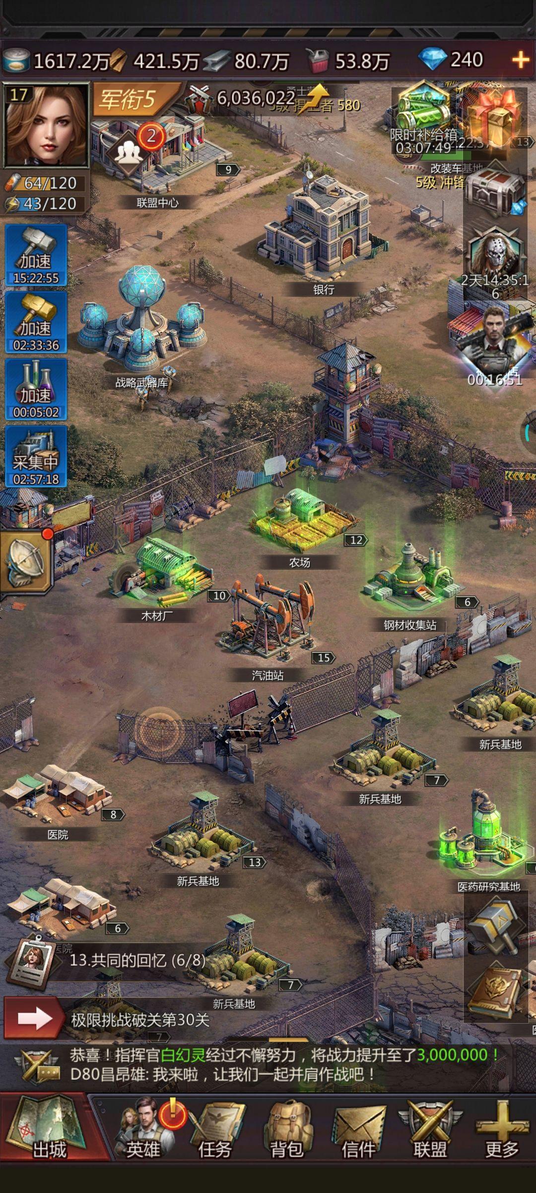 优先建造2个木材厂,2个食物厂,2个催产剂,5个医院,10个新兵训练营,6个钢铁厂,8个石油厂(给的建筑坑位只有35个,后面可以把催产剂都拆了,催产剂主要靠野外打怪得)