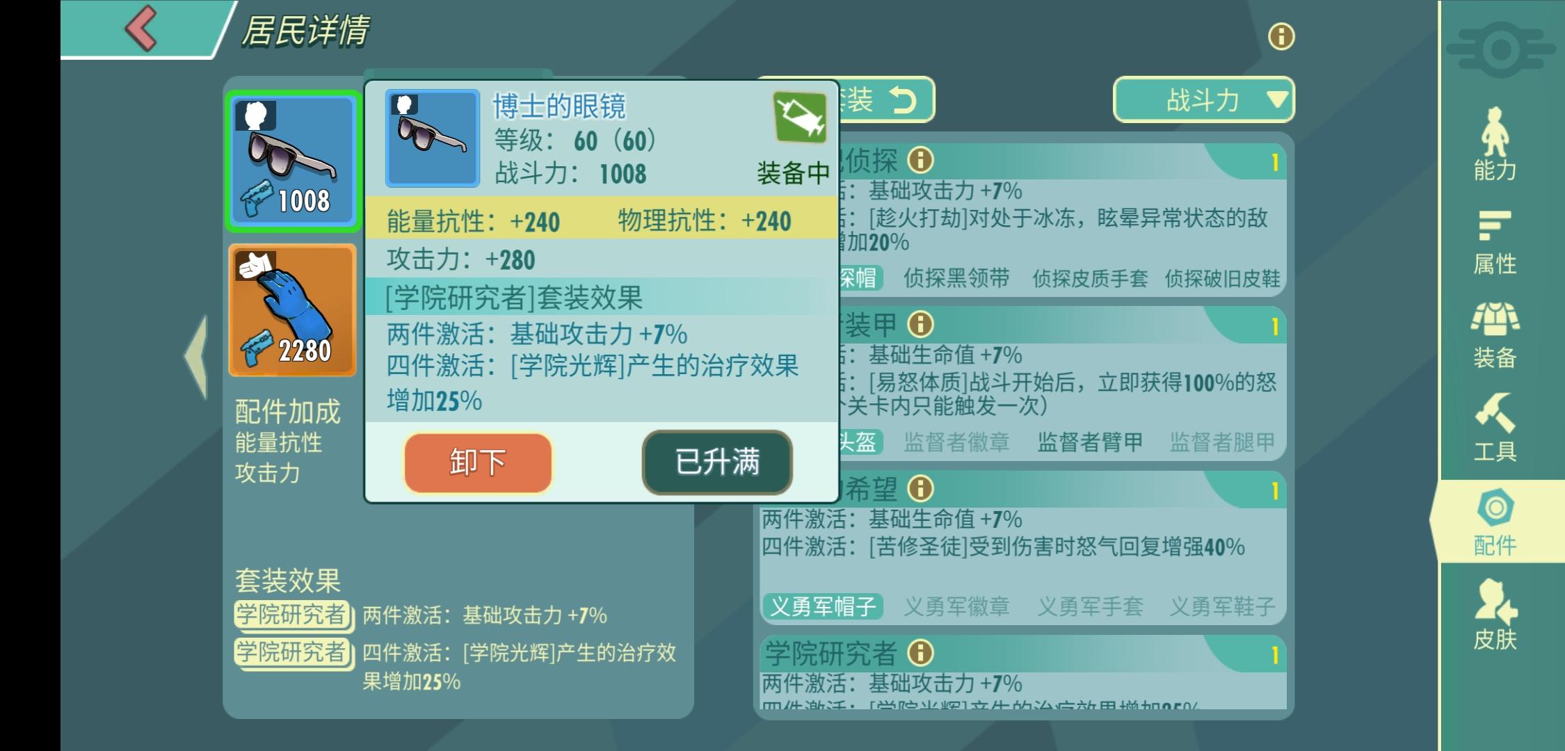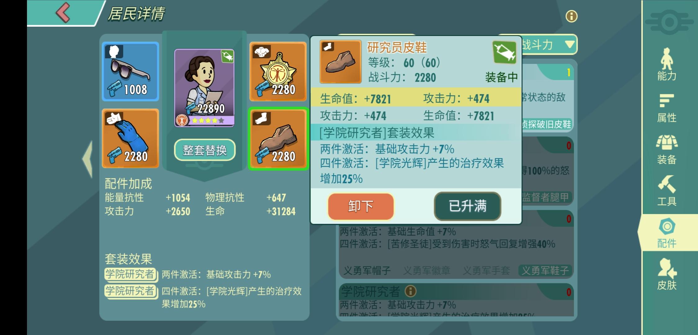 上面两种黄色背景下的属性就是固定属性无论多少件鞋子都是这个属性,然后下面的两种属性就是随机属性是当你获得这个配件随机生成的属性它不可控。然后说下什么人需要什么属性。例如前期你打生存模式的关卡刷到一个医生橙色的配件属性加闪避你自己本身有一个蓝色的配件是加攻的,我们应该要蓝色的因为前期很缺少配件升级的材料我们应该选择对我们最有利发挥的作用最大的,医生闪避没用因为是前排挨打他又不会挨打(大多数情况下),而攻击力可以让他的奶量更多前排就更不容易倒下,这就是为什么“前期看属性”。那件橙色的可以选择留着也可以选择分解,三个材料在合成,我认为最好是留着,到后面的生存关卡可能并不会再给了虽然是有闪避但是别的属性还是有区别的