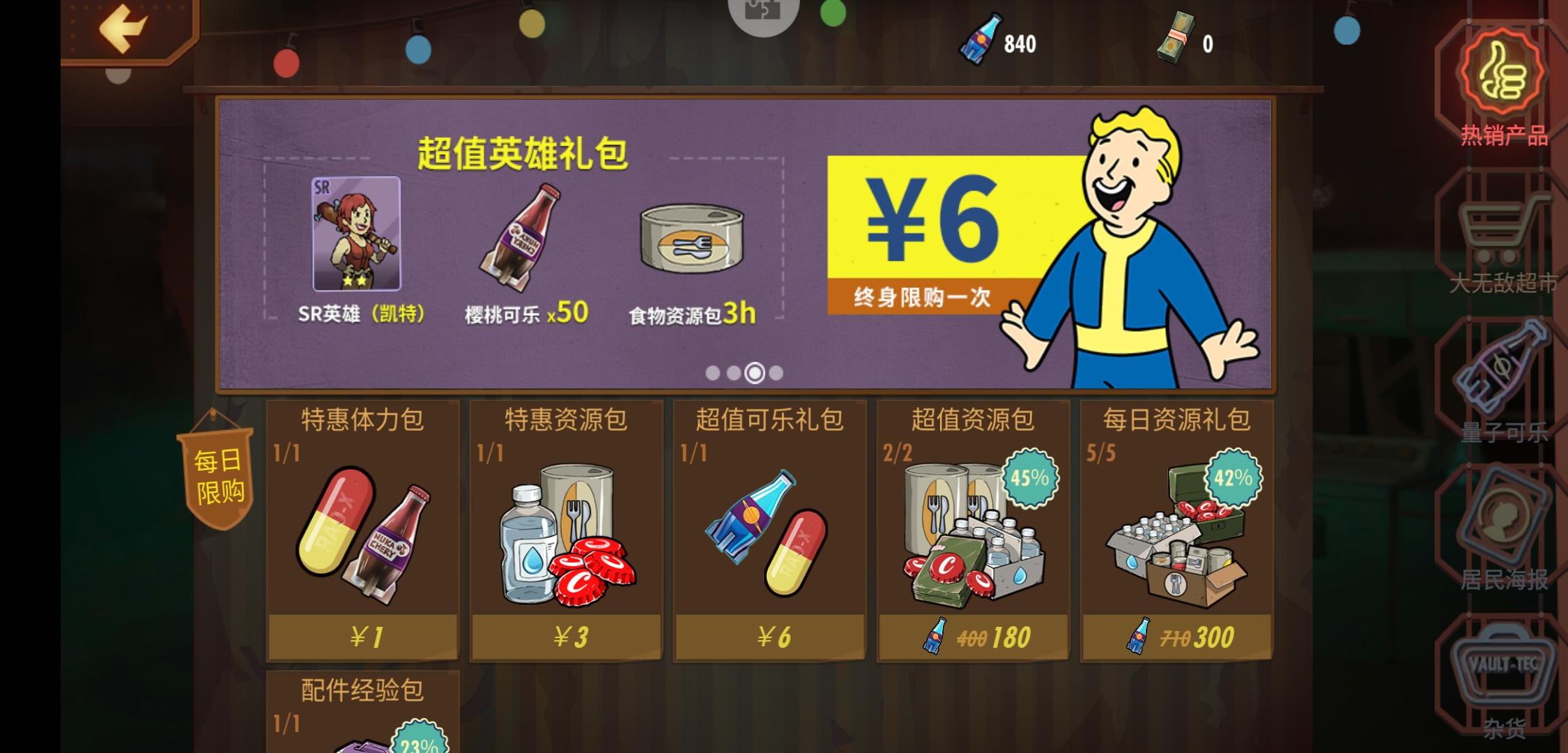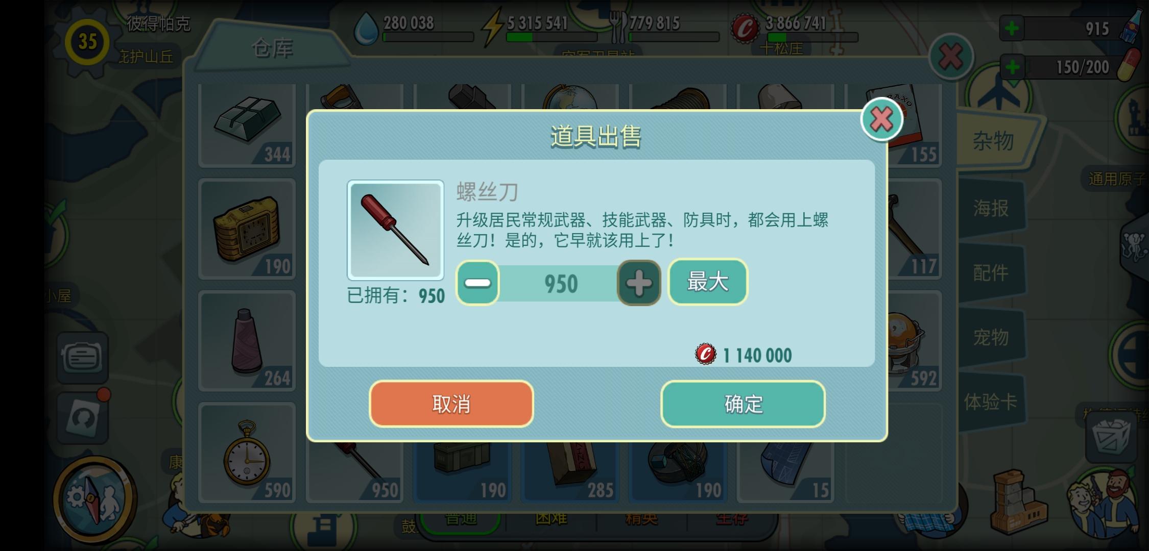 到后面升级装备缺瓶盖了可以选择卖材料我就卖过几百万的瓶盖嘿嘿