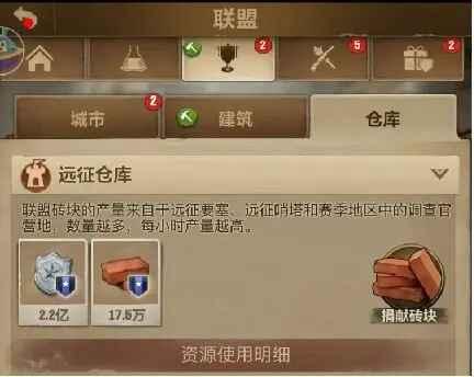 联盟仓库是显示联盟积分与资源以及使用情况的地方。在赛季中,联盟成员还能通过捐献捐献钻石获取砖块,用于对远征哨塔的建设。