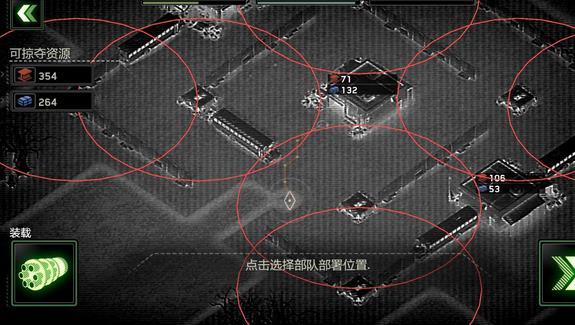 3、开始任务后,需要先设置『部队部署』位置,红圈内为高塔区,不能部署此处,建议观察『可掠夺资源』的周边建筑,计算每个障碍物的离资源点的距离,以及任务目标要求是什么,尽量完成目标以获取更多的资源,当然任务在前期都很好胜任,获得的宝箱可以开出5.56毫米机枪、MP5冲锋枪或是火炮等装备,以及等级经验,点击『战队图标』可查看全部武器以及设施,红色代表未获得