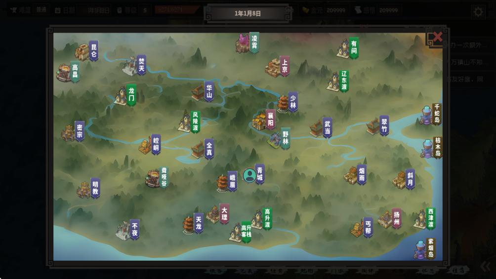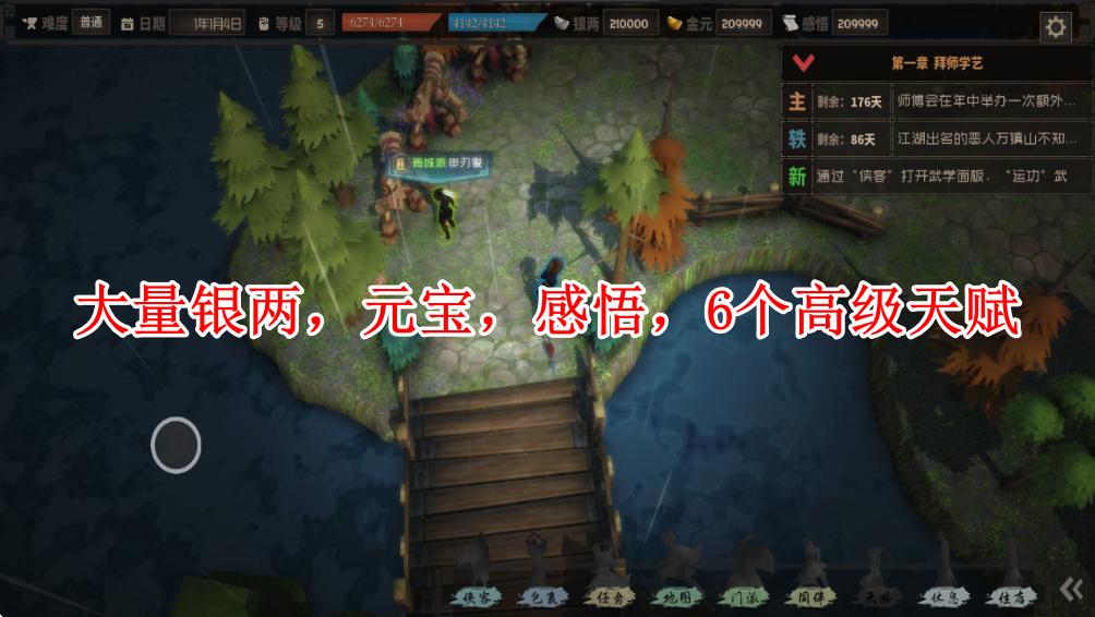 ⑨开局天赋选+5御剑+10防御和600内力,做新手引导——打开行囊学习初始武学(微势,轻功,内功,剑法)——右下蓝色大圆盘躲避飞剑修炼(选5天,坚持26秒就可以+1000多武学经验,轻功加速,招架生成保护罩,我觉得武学经验获取最快方式)把3个武功练满———木桩随便刷一个师兄互动,界面右上角比武——找到掌门接任务(送信到各个门派随机,遇到比较远的地方前期轻功低,可以到门派下面的渡口,转渡省时间)——襄阳或者扬州找到武馆弟子切磋。