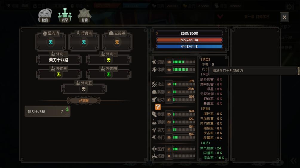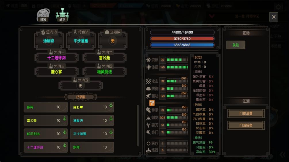⑦内功(不同内功增加属性不一样,具体可点击查看),使用的武学和内功最好是相同属性,可以发挥武学最大效果,根据自己爱好搭配,不运功的内功,只能享受它右边框带来的属性加成