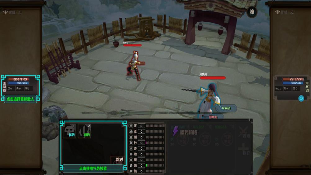 ⑥势(正—刚—快—险—奇—煞—慢—柔—妙—正9种,每种武学需要相对应的势气值才能出招),战斗界面左右两边人物状态栏会显示势的多少,出招可以选择集势(增加自己的势方便出武学)、降势(降低对面势,让他只能普攻)两种方式,相克属性的武功造成伤害+50%,每个回合自身累计势额外增加,每场战斗会累计势气(具体不知道多少),达到一定数值会触发武学对应属性的特殊效果(比如累计势是100,每个回合自身集势10,那么10个回合后出发特殊效果),例如险:下个回合攻击暴击+20%(其他的点击所学势,右边会刷新介绍),越高越好