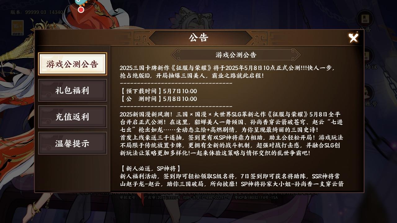 征服与荣耀是一款融合了卡牌养成与策略战争两种经典玩法的三国题材手游,由广州游动网络科技有限公司开发。游戏采用了最新国漫运用的美术风格,呈现出一个别具一格的三国世界。玩家将以主公身份穿越至三国时代,招募历史名将,组建各国势力,展开一段精彩的三国之旅 。